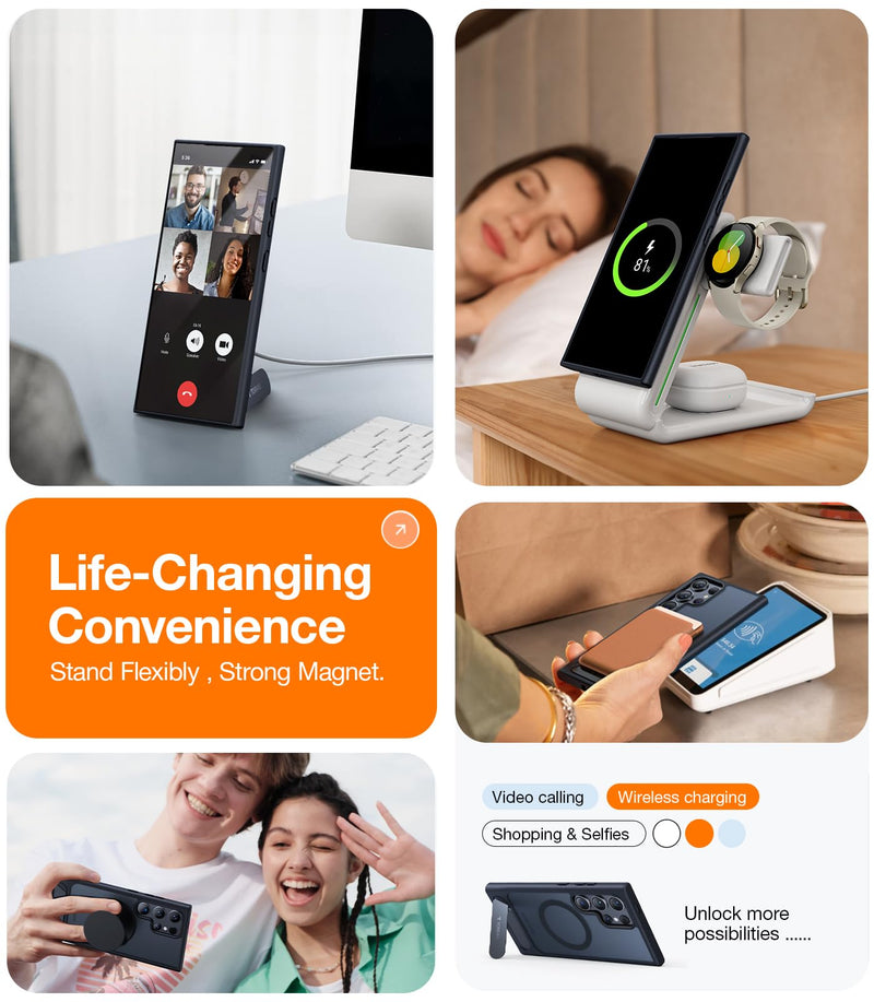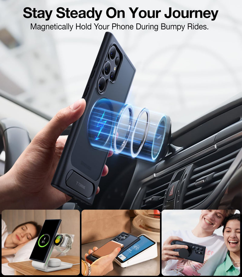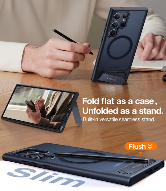 • Stand Up, Power Up: (TORRAS' LATEST FOR 2024 phone case for Samsung Galaxy S24 Case.) Pstand provides a tech-advanced solution combining aesthetics, protection, and convenience. A slim, flat plate in stand form offers a hands-free and multi-angle tilting experience, while its built-in magnetic ensures uninterrupted wireless charging.